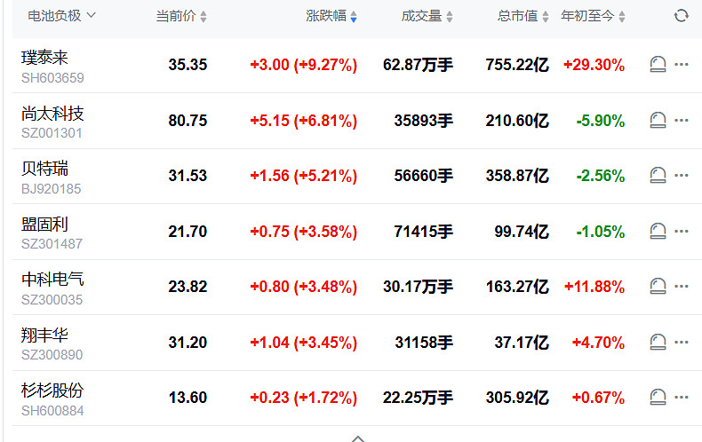 负极今天难得集体大涨