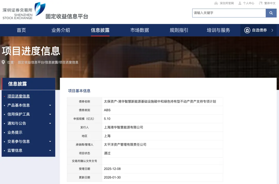 近日,太保资产-港华智慧新能源基础设施碳中和绿色持有型不动产资产支持专项计划在深交所的项目状态为通过!申报规模5.1亿元,发行人上海港华智慧能源有限公司,管理人太平洋资产管理有限责任公司。
