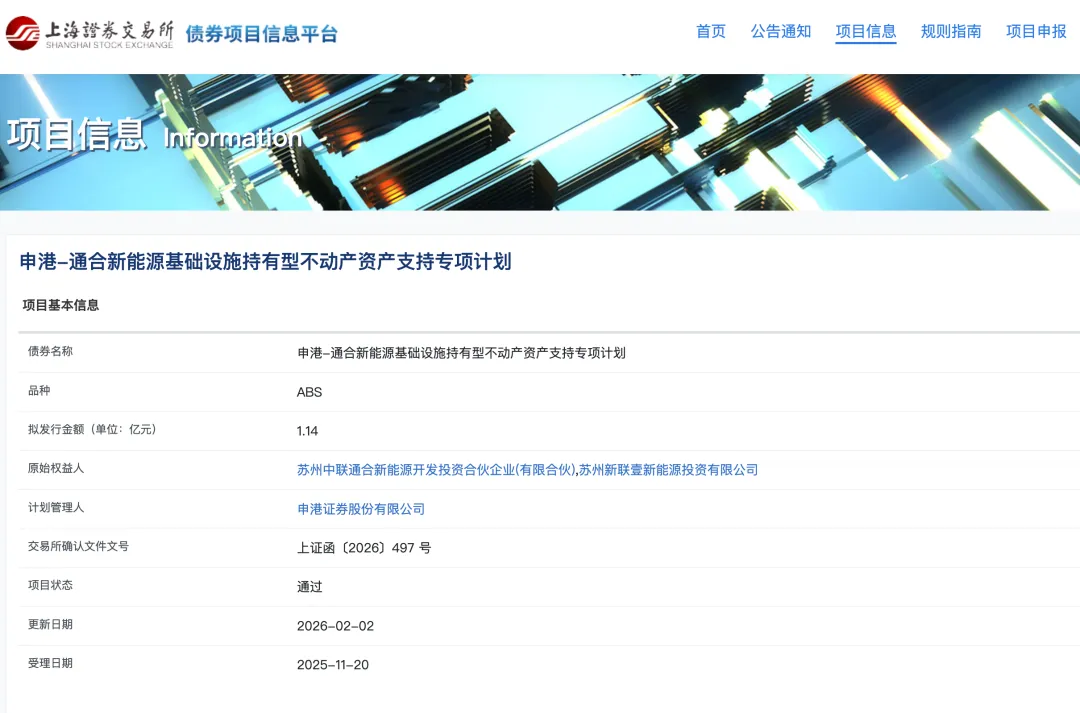 申港-通合新能源基础设施持有型不动产资产支持专项计划在上交所的项目状态为通过!拟发行金额1.14亿元,原始权益人苏州中联通合新能源开发投资合伙企业(有限合伙),苏州新联壹新能源投资有限公司,计划管理人申港证券股份有限公司,交易所确认文件文号上证函〔2026〕497 号,受理日期2025-11-20。