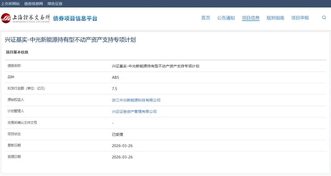 据上交所官网显示,兴证基实-中光新能源持有型不动产资产支持专项计划正式申报并获得受理。该项目原始权益人为浙江中光新能源科技有限公司,计划管理人为兴证证券资产管理有限公司,拟发行金额为7.5亿元。