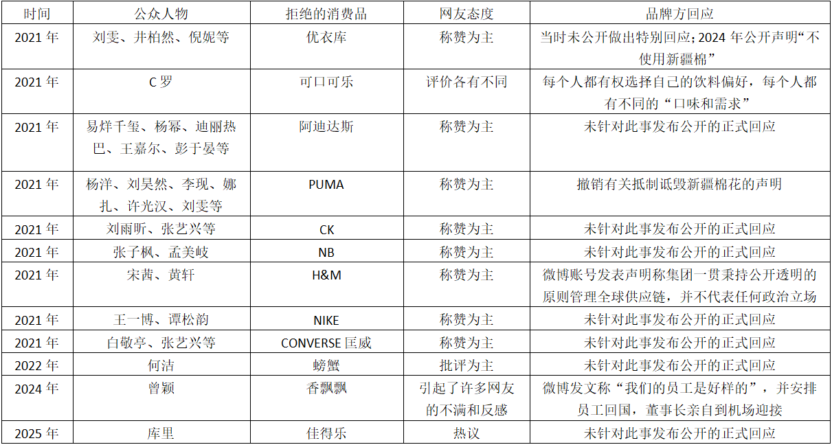 在我们收集到的案例中,2021年后,公众人物“拒用”消费品的案例较少,但不可置疑的是,这些案例不仅充满了“戏剧性”色彩,而且也具有一定的代表性,与2021年的“立场驱动”形成鲜明对比。