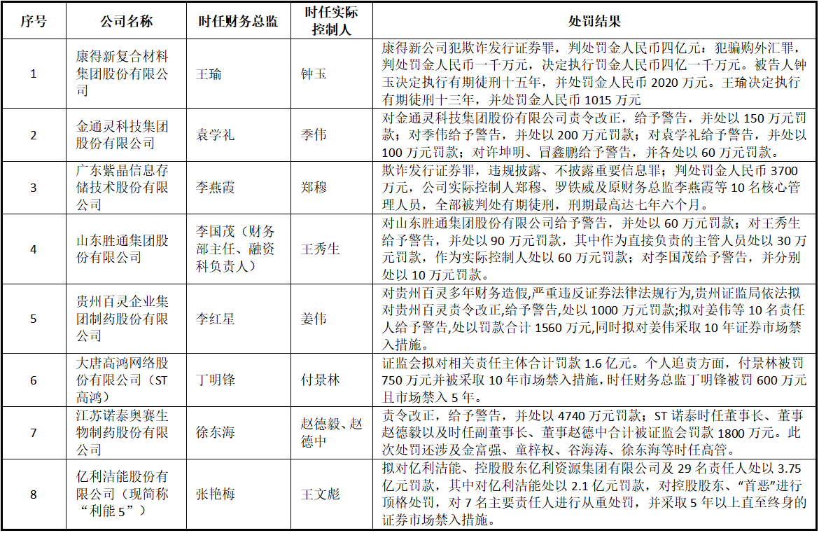 在上述案例中,公司实际控制人与财务总监等均面临严厉的行政处罚,甚至刑事处罚。康得新公司钟玉被判决定执行有期徒刑十五年,并处罚金人民币2020万元;王瑜决定执行有期徒刑十三年,并处罚金人民币1015万元;ST高鸿董事长付景林被罚750万元并被采取10年市场禁入措施;时任财务总监丁明锋被罚600万元且市场禁入5年……