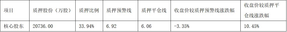 截止2026年2月7日,祥源文旅整体质押股份为2.07亿股,整体质押占总股本之比为19.66%,累计质押市值13.87亿元。其中,公司控股股东及一致行动人质押2.07亿股,其质押占其持股比例为33.94%。公司控股股东及一致行动人质押股价预警线(预估)为6.92元/股,平仓线(预估)为6.06元/股。截止2026年2月7日,公司股价为6.69元/股,较质押预警线涨跌幅为-3.35%,较质押平仓线涨跌幅为10.45%。