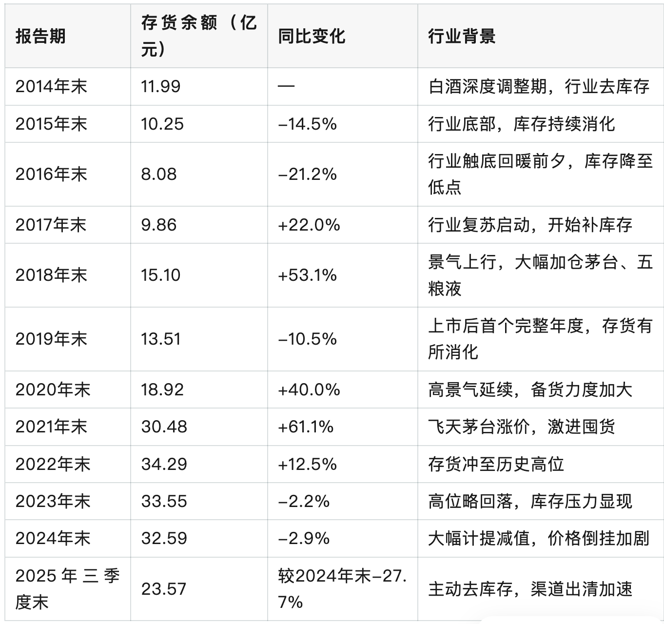 2015–2016 年:存货一路从 10 多亿降到 8 亿多,是上一轮白酒寒冬的尾声,大家都在拼命砍库存;
