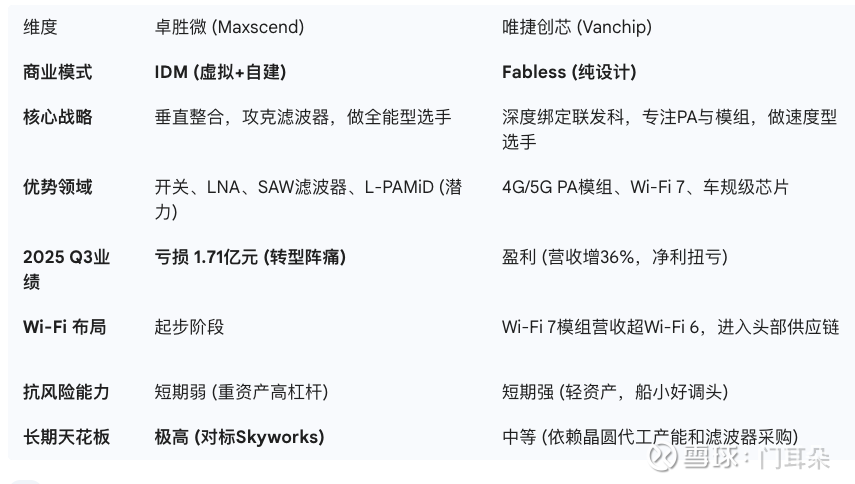 唯捷创芯在2025年Q3的优异表现(营收同比增长36.28%,净利润扭亏为盈)5,证明了在行业复苏初期,Fabless模式具有更快的响应速度和更低的盈亏平衡点。特别是其在Wi-Fi 7和车规级产品上的先发优势,抢占了部分市场红利。