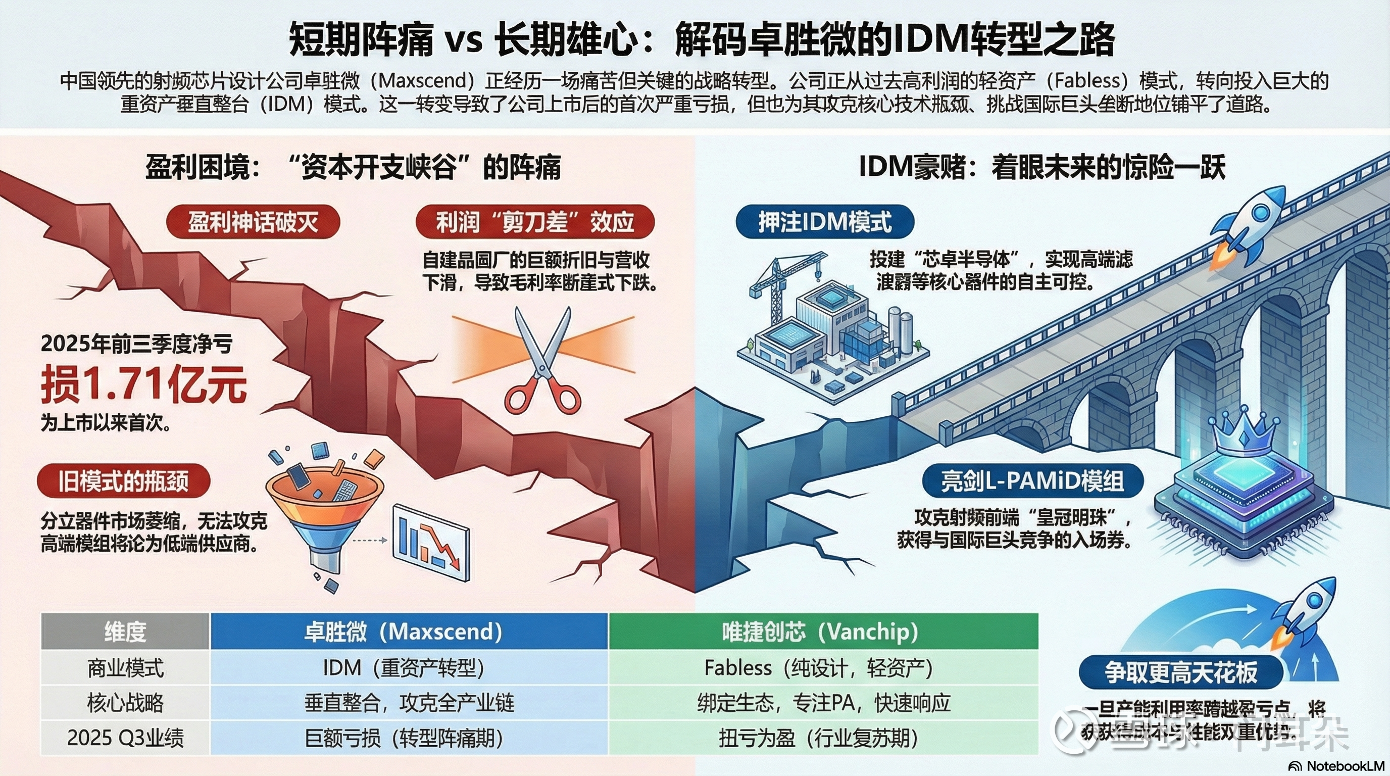本报告基于详尽的行业数据、财务模型及产业链调研,提出以下核心投资逻辑:卓胜微目前的财务恶化并非经营失效,而是其向IDM(垂直整合制造)模式转型过程中必须支付的“入场券”。 公司正处于“资本开支峡谷”(Capex Valley)的底部——巨额的晶圆厂折旧、高昂的研发投入与尚未完全释放的高端模组产能形成了完美的“剪刀差”,狠狠地切割了公司的利润表。