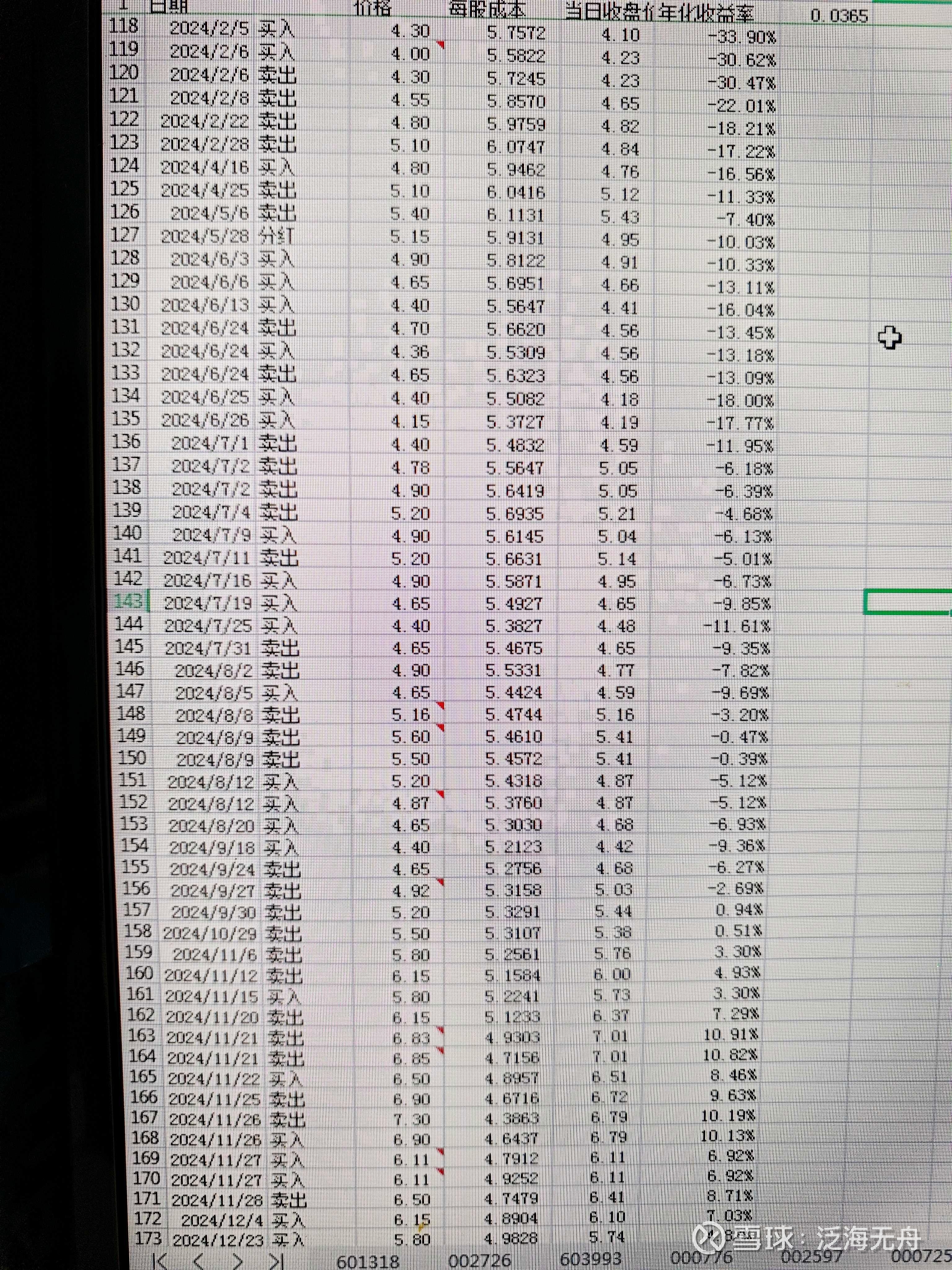 2024年部分交易情况如图所示,第一列为交易日期,第二列为交易价格,第四列为每股成本,第五列为当日收盘价,第六列为年化收益率。