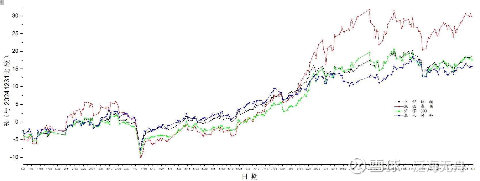 上图是本人2025年度股票收益率与上证综指,深证成指,沪深300的幅度值比较。可以看出,目前的股票组合收益率曲线比较贴合沪深300与上证,浮亏最低值-7.75%,浮盈最高值18.52%。