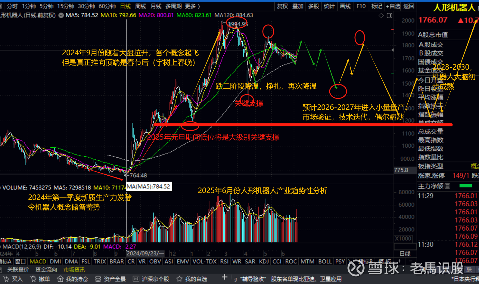股市4.0时代,第一个大阶段最迅猛,初始3-6个月涨幅最大(以前信息传播发酵慢,这个周期可能需要半年-1年来完成,但是自媒体和大数据时代,加速了这个进程)。而第一阶段这3-6个月也可以拆分成三波来做:第一波是政策推动或者技术突破引发市场聚焦,第二波是政策得到市场资金力捧,相关概念股不断深挖,第三波是市场开始分歧,部分企业加强投资,部分企业辟谣,此时资金聚拢在一些比较确定的概念股中,将其推至顶峰(2025年4月份之前的人形机器人走势就是代表),随后进入漫长的第二个大阶段。这三波能吃到两波就很好了,最稳妥的是吃中间这波。