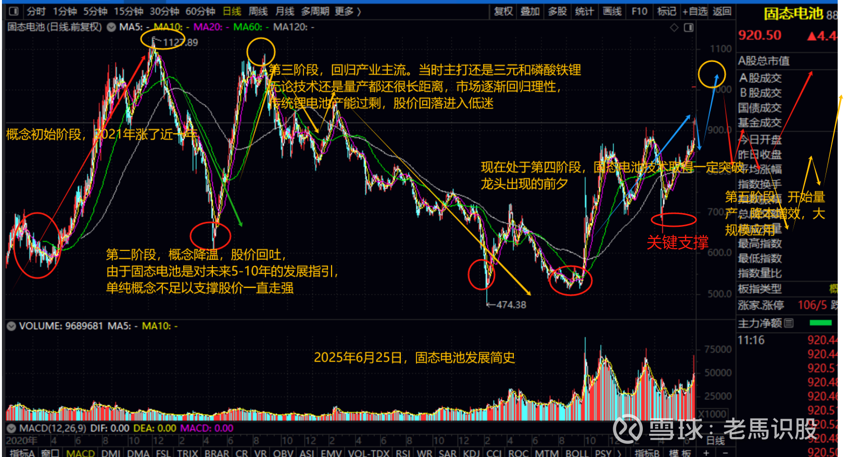 以下是固态电池发展图(图中二三阶段可以合并成一个阶段,整体属于第二个大阶段,图中第四四阶段也是实际中的第三大阶段)。这个阶段个别股会提前领跑(例如金龙羽,上海洗霸,国轩高科),但是大市值的股上涨会慢一点,例如:璞泰来,赣锋锂业,宁等时代,先导智能,且走势会比较反复。中短线不断做区间获利也不小,就算被套也可以做T上去。