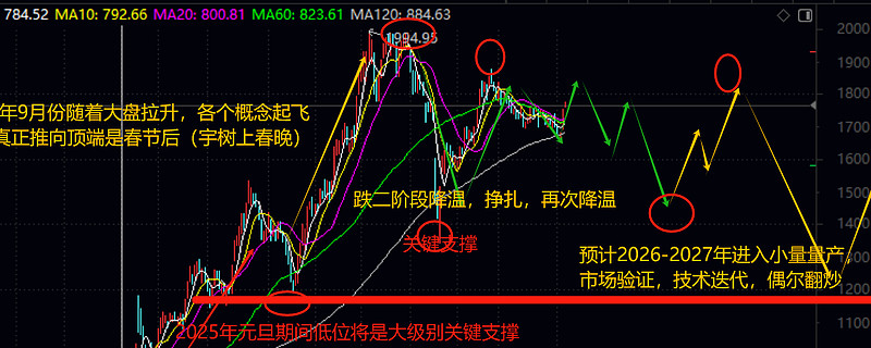 第二个大阶段整体是往下的(类似波浪理论的二浪),这个阶段操作机会较少,回踩30-50个点之后会有一波反抽(具体力度看个股情况而定),然后形成次高点或者第一阶段顶部之后继续往下调整,当下人形机器人和低空经济就处于这个阶段。