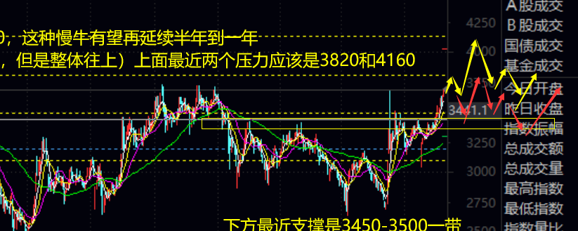 今天$上证指数(SH000001)$ 突破了3570,目前市场指数似乎有慢牛的迹象,但是这种慢牛不是美股那种长期慢牛。更像是大A2019-2021年的行情(两年左右的上涨行情),从周期看,去年9月到现在过去快一年了,而指数选择这个阶段上攻,如果成了就是中继成功,将这种慢牛再延续半年到一年(期间会有大回踩,但是整体往上)。年初预期上证有望冲击3700甚至4000点数(其实严格意义上来说,破3670之后上面最近两个压力应该是3820和4160)这个预期不变,只是时间提前了一点,而4160这个点今年难度有点大。创业板指数上面最近压力是2576和2780附近,2780今年也还是有机会的。再往上就不敢奢望了,反而题材轮动这个思路不变,因为目前基本面上维稳决心较强,货币政策相对宽松,加上外围关税影响在衰减,稳住指数是可以的,但是打造2015年那种牛市不现实,大盘维稳,题材抱团轮转是主旋律。