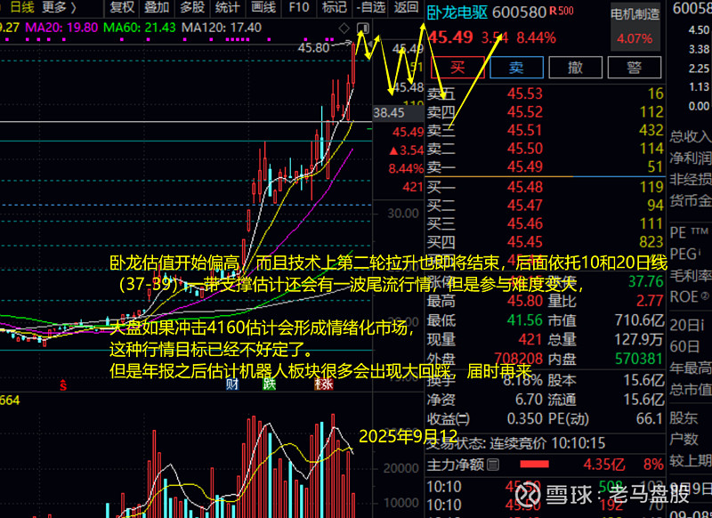 $卧龙电驱(SH600580)$ 今天机器人板块合力上行,不过这是属于二浪大回踩中的翻炒为主。除了个别有业绩支撑的(三花,拓普)很多股纯靠故事支撑,目前靠故事上来的有卧龙和$中大力德(SZ002896)$ 两大代表。其余多数熄火横盘为主了。