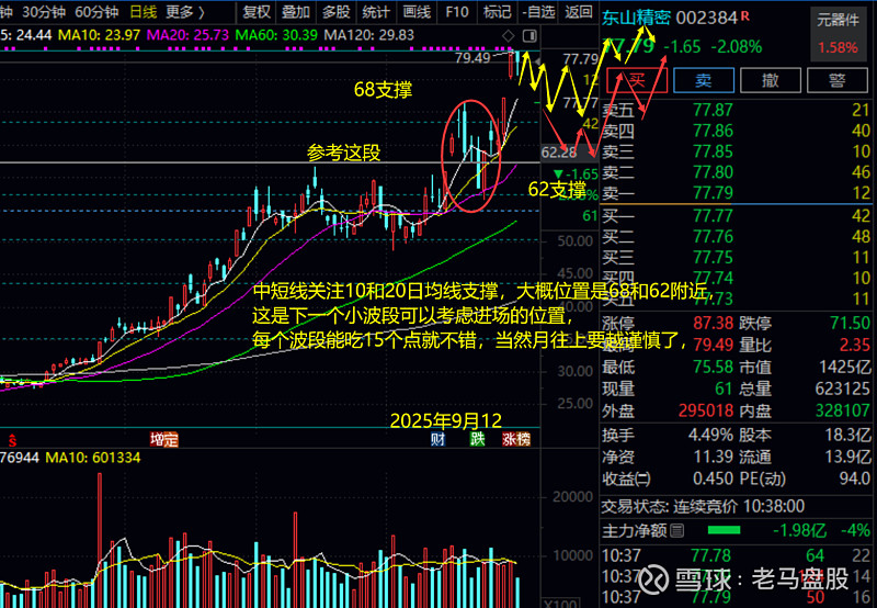 $东山精密(SZ002384)$ 今天算力板块开始分化了,PCB概念股多数完成了连续三天反弹或者累计反抽超过15点了,所以落地一大部分为上,虽然强者恒强,但是最近两周算力板块还是出现了两次大回踩的,要不是甲骨文这个外挂,恐怕反弹力度也没这么大。东山这次支撑也要微调一下了。沪电股份59支撑不变,短线还可以关注一下20日线支撑(63)