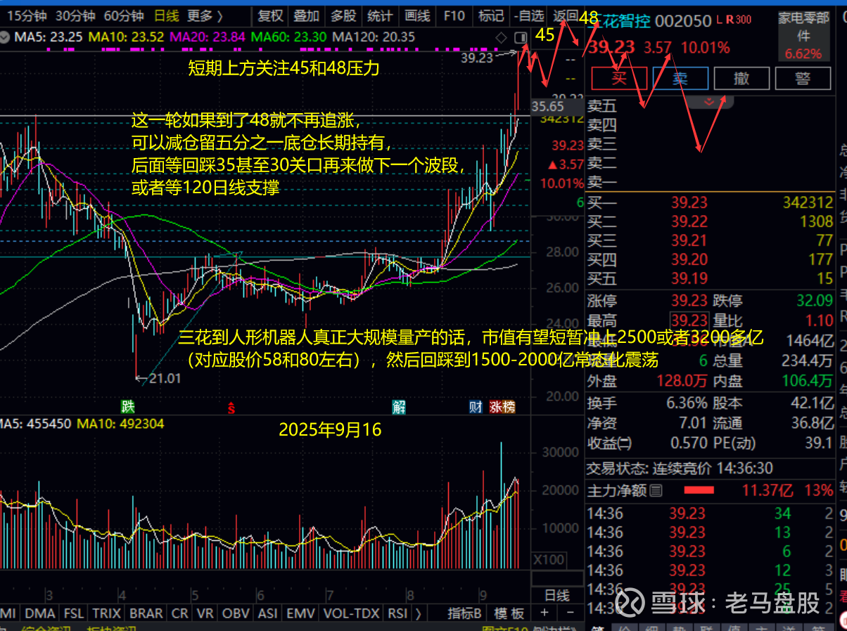 整体来说人形机器人概念分化严重,大周期来看,后面至少还有两大轮行情(规模化量产开始和AI智能的迭代,或者是工业机器人替代到生活通用机器人),目前还是概念炒作阶段,马斯克提醒供应链要重新打造,后面必定会大回踩洗牌,届时要选好标的敢于布局。三花和拓普这种第一梯队的要保留一定底仓,波段往上做,遇到大回踩分批进比较好。这两个最后涨幅不一定是最大的,确实较稳较长久,抗跌能力也较好的,所以选择什么标的,还是看个人喜好。以上仅供参考,风险智控