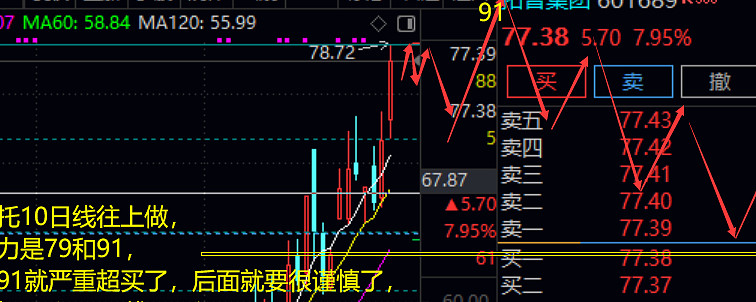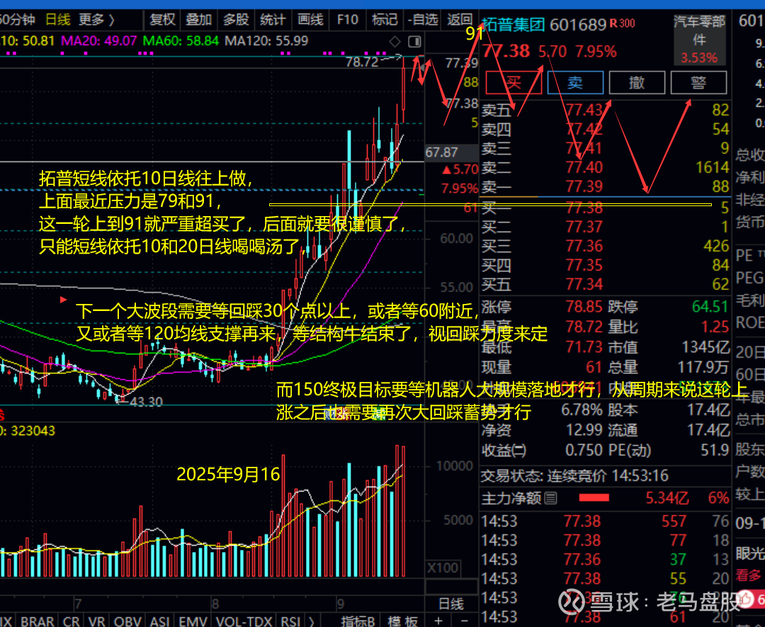 同理拓普集团在从2019年到2022年得益于新能源汽车爆发,从6元附近涨至60元,涨了10倍(期间最高市值1100亿左右,最低500亿),如果三花能去到3200亿,那么拓普估计也能到2500亿,也就是从30元(去年最低位置),起步翻五倍,顶峰价格有望去到150。目前价格是77,刚好还有一倍左右空间。短期拓普上面关注79和91压力,到91之后这一轮要很谨慎了,目前还形成不了“易中天”那种情况,150这个终极目标是长线的,至少需要一次以上大回踩蓄势再说。
