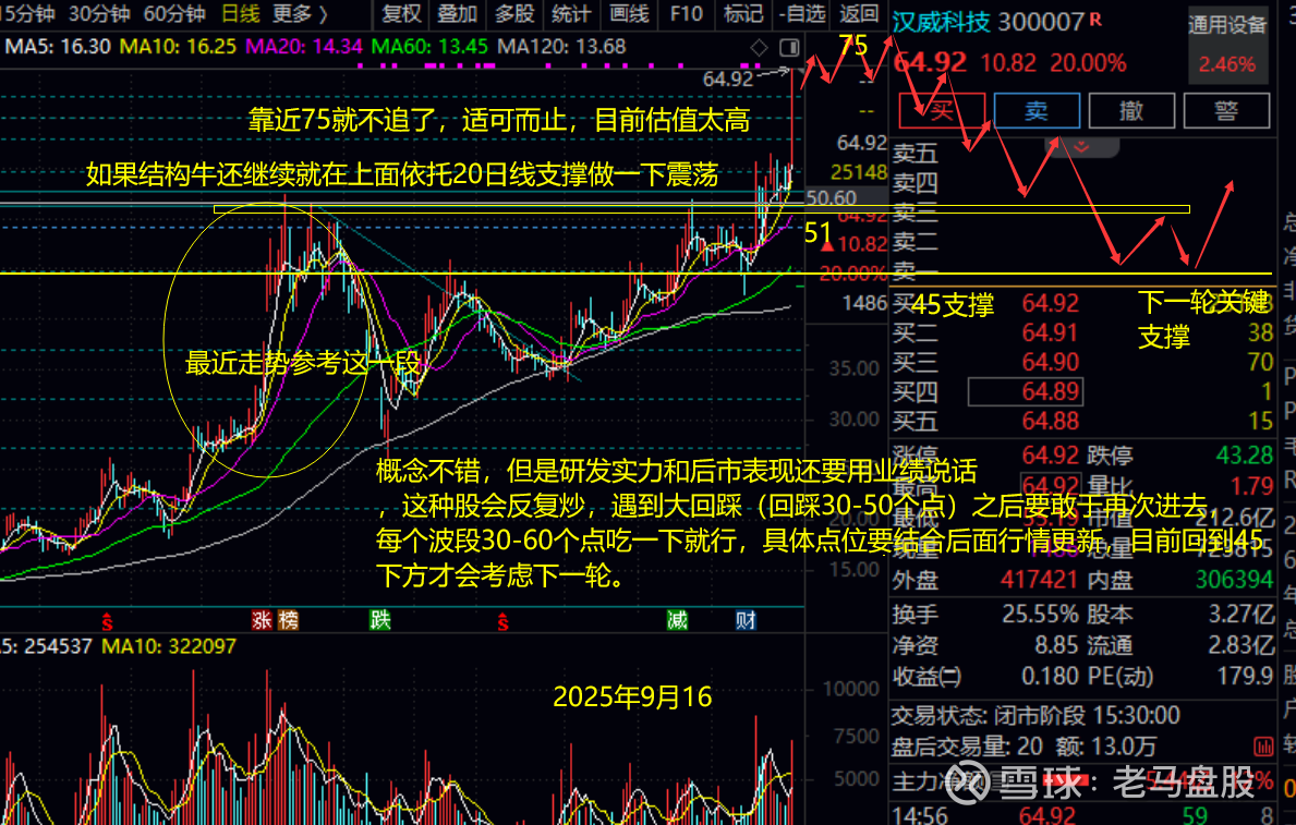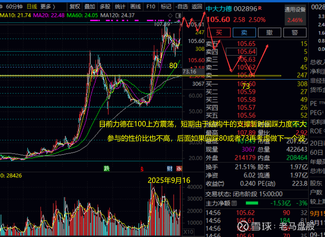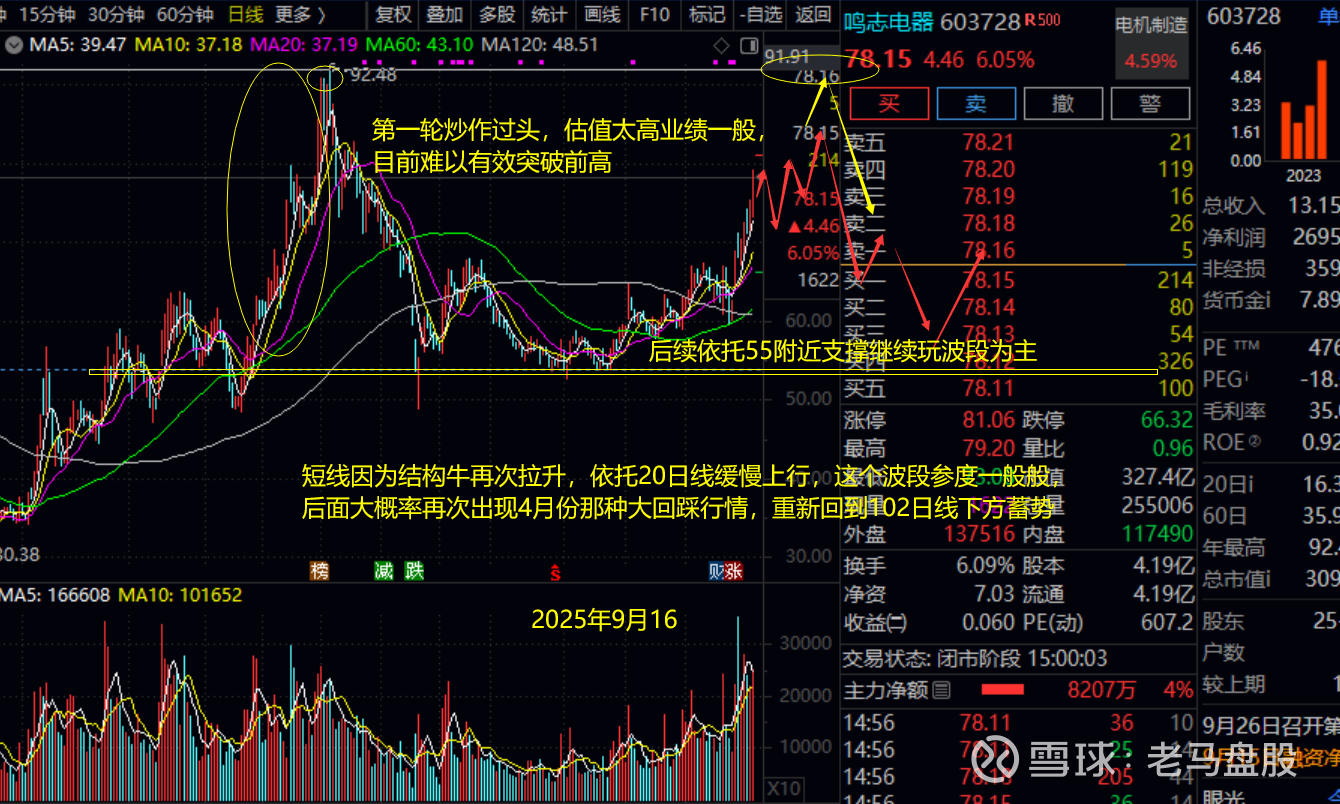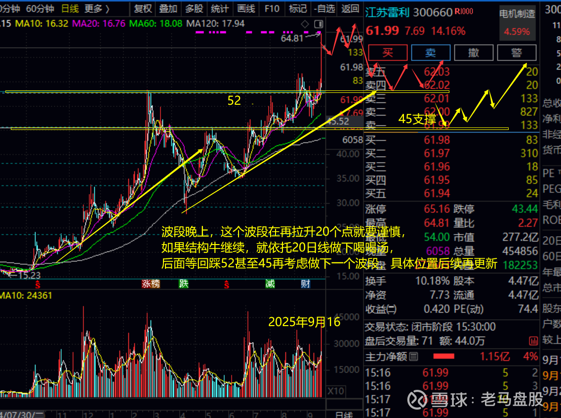 江苏雷利走势比较规整,目前放量上行,再拉升20个点左右到70附近就要谨慎一点了,后面还会大回踩给机会做大波段的。过分追涨小心出现4月份那种大跳水收割行情