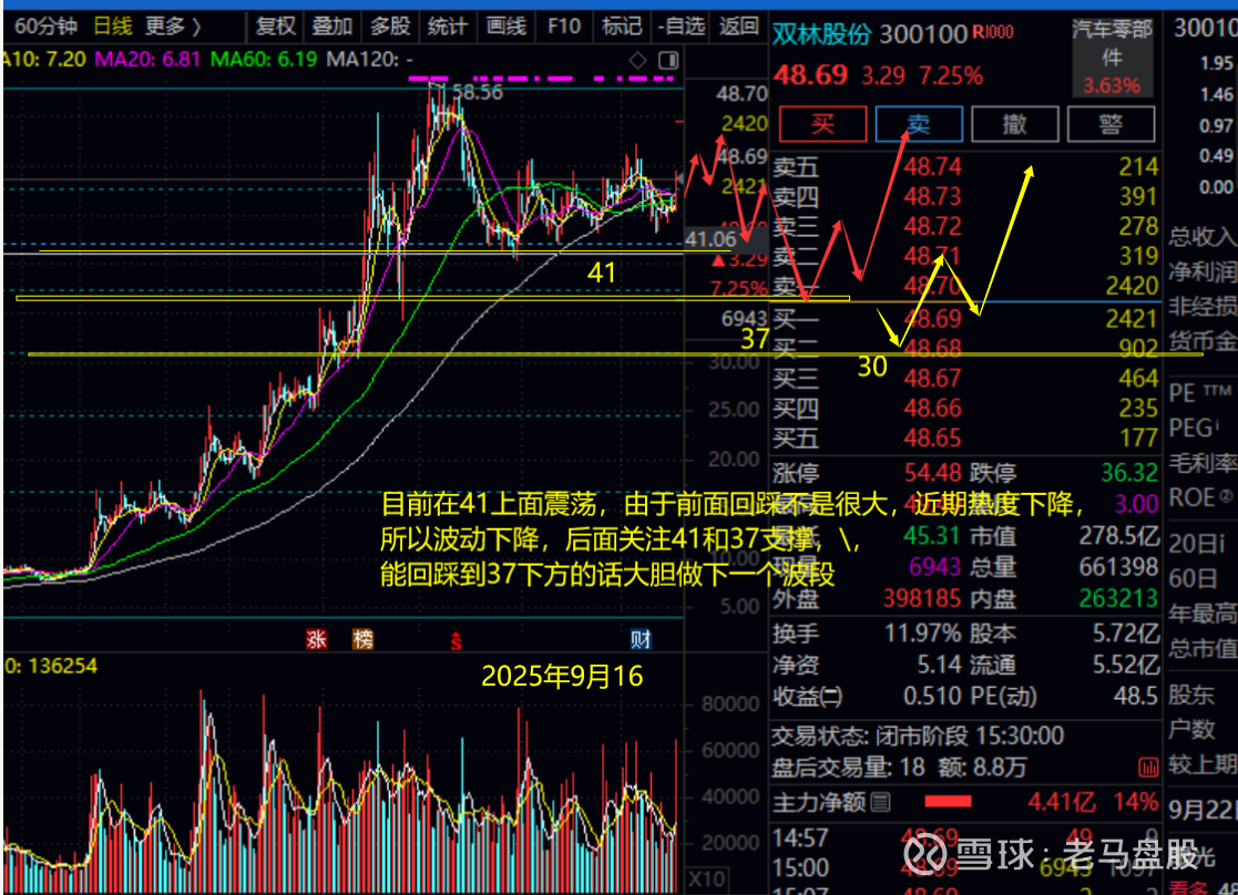 双林股份41附近有强支撑,但是最近缺乏热点,估值也不低。长期是不错的标的,相信后面还会翻炒