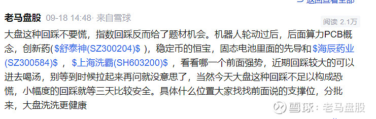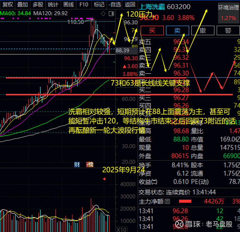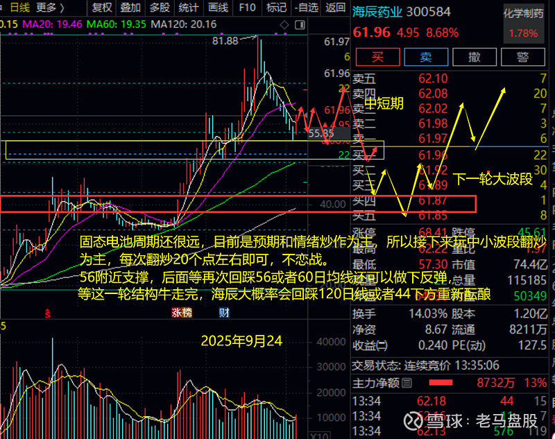 $海辰药业(SZ300584)$, 今天固态电池终于反弹了,上周四就提醒海辰和$上海洗霸(SH603200)$这种前期热点回踩大的可以继续近期喝汤 ,不过没给具体支撑。现在看来海辰再56附近有支撑,后面回踩56或者60日线可以做一下反弹,下一个大波段可以等120日均线重新酝酿。上海洗霸预计会在88上面高位震荡一阵,甚至还可能短暂破前高,结构牛结束了才能回踩73或者63酝酿下一轮大波段