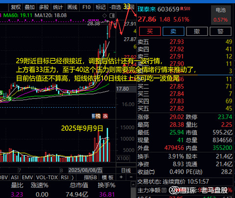 $璞泰来(SH603659)$ 今天锂电池方面再次轮转回来,璞泰来虽然爆发力一般,但是整体走势较稳,冲击28附近后进入震荡调整,10日均线支撑转换成20日均线了,大概25.5附近,再往上就是33压力,目前固态电池周期还没到,电池属于短炒一轮,璞泰来到33之后要谨慎一点,可以一些仓底,然后等回落23下方重新布局。而$金龙羽(SZ002882)$ 波动较大,到关键支撑位可以翻炒喝喝汤