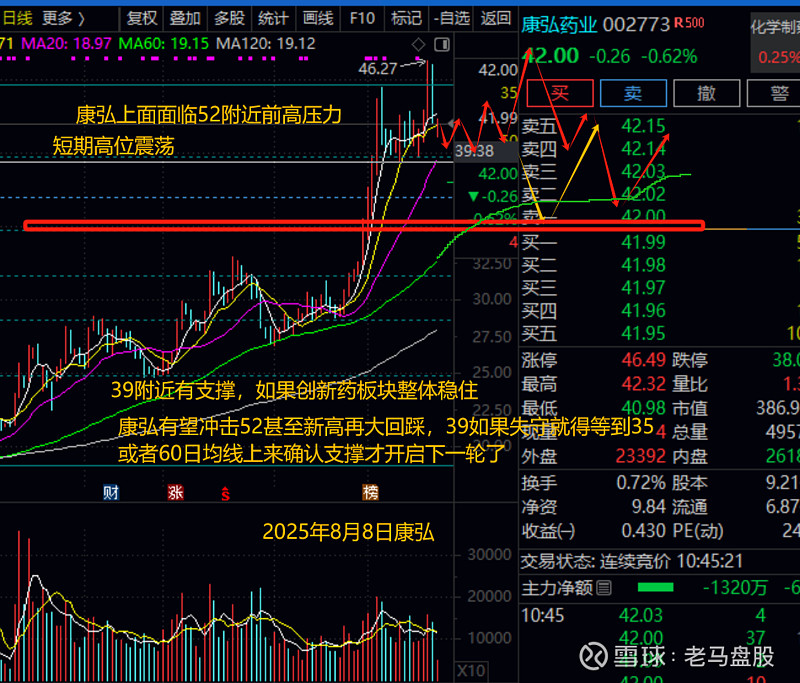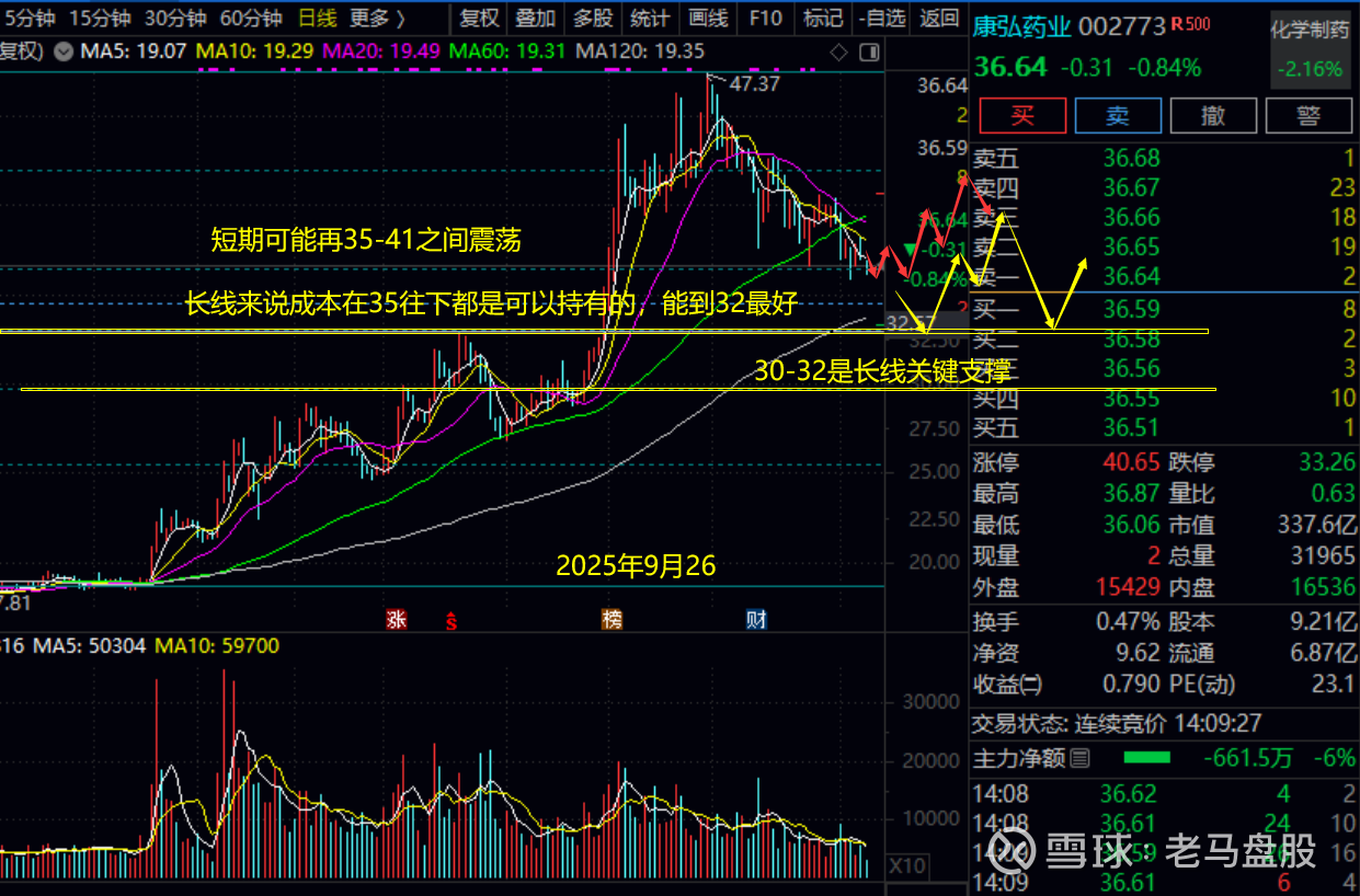 康弘药业已经下破了39支撑,而且随着60日均线上移,目前在冲击120日线支撑(35附近),之前预期是35附近确认支撑油机会开启下一轮,目前时间周期不对,但是价格可以,所以分批最好,极限考虑到30-32仓位即可,本身估值不高,35下方长线是不用过于担心的,只是大盘回落可能短暂拖累。