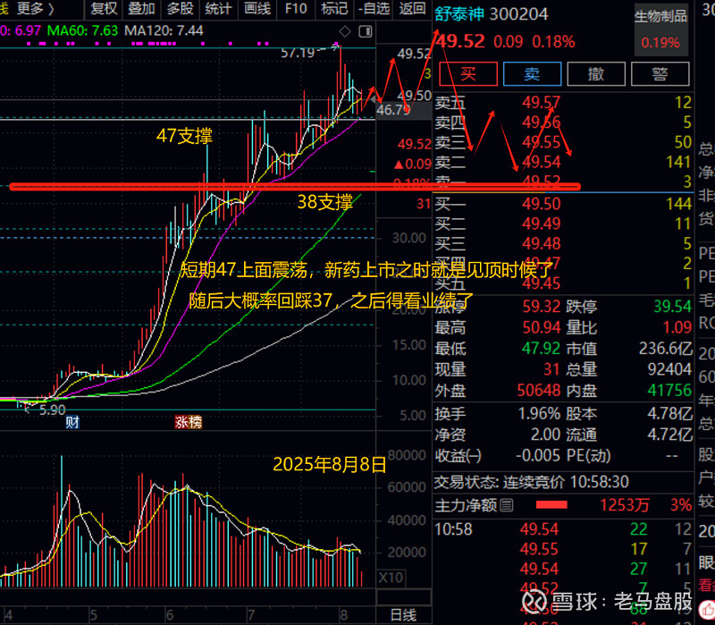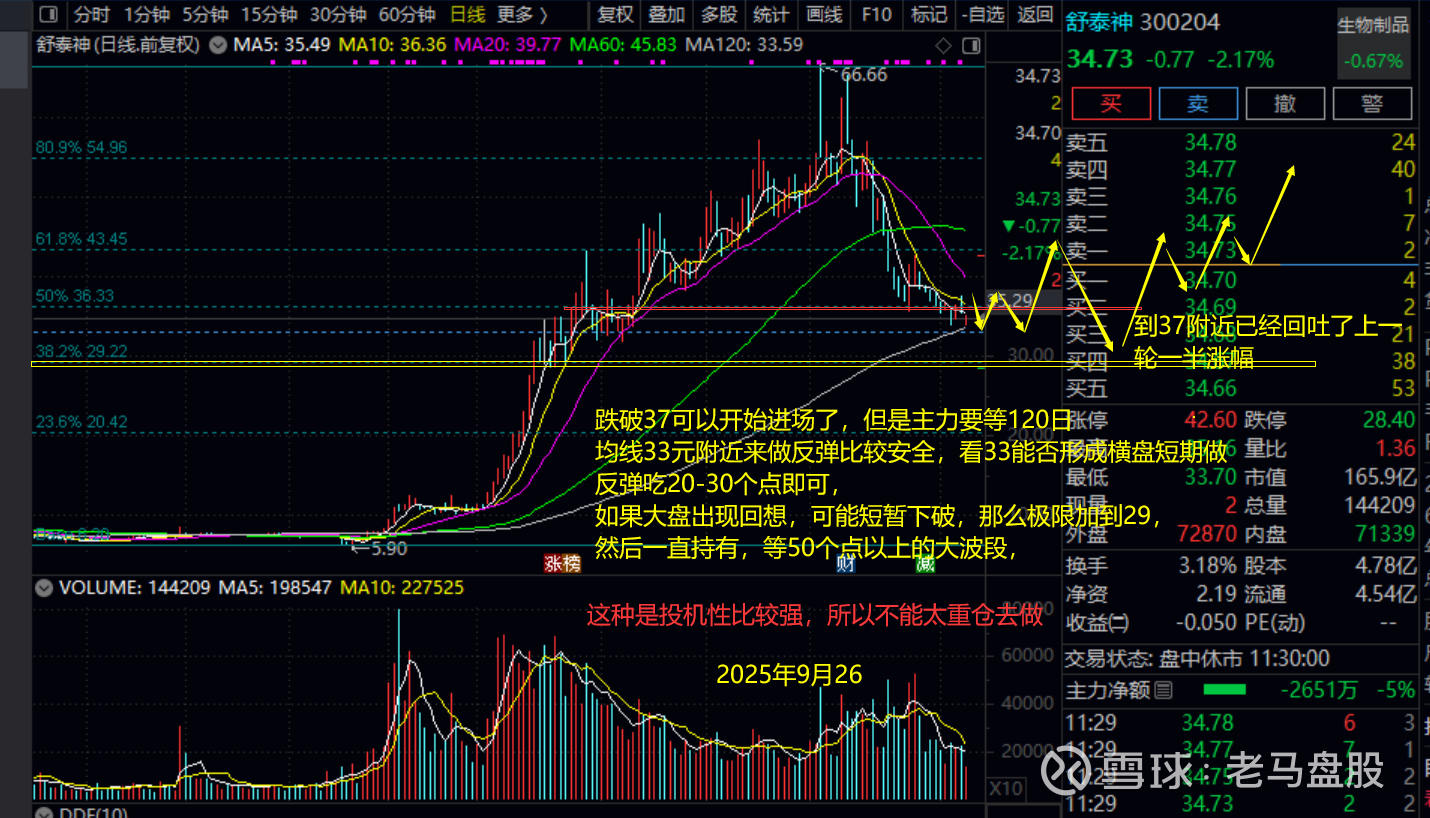 舒泰神跌破37之后已经回吐了50%的涨幅,如果按总价算50%则是33附近,也就是说37下方可以进去做下反弹了,下图是8月份的分析,当时觉得等新药上市之后才会回踩那么深,现在看来,第一波提前完成,新药上市应该需要重新酝酿行情,目前处于二浪大回踩中。