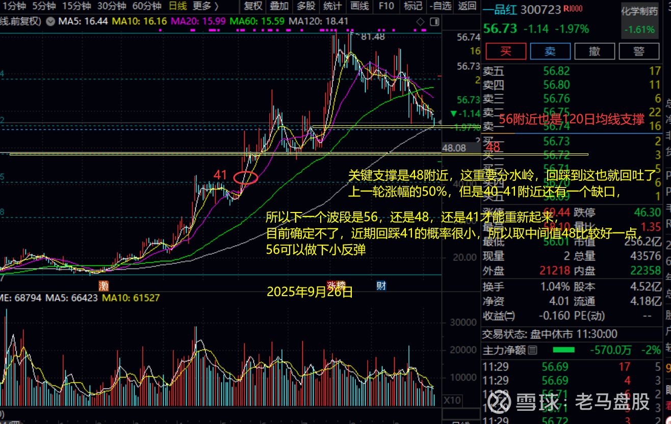 一品红回踩力度小一点,目标到了120日线支撑,再往下就是48,这个是关键位置