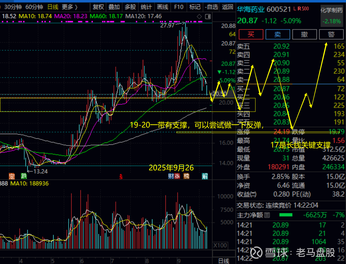 华海药业相对弱一点,本身是靠仿制药和原料药支撑,公司布局细胞免疫治疗、CAR-T疗法等前沿领域,多个产品处于临床前研究阶段,但尚未形成规模化收入,市场对其创新药转型产生遐想,令其股价一度翻倍,不过目前已经回吐一半涨幅,技术上19-20附近有支撑,长线看17附近支撑,创新药翻炒的话,20-30个点机会喝汤还是有的。