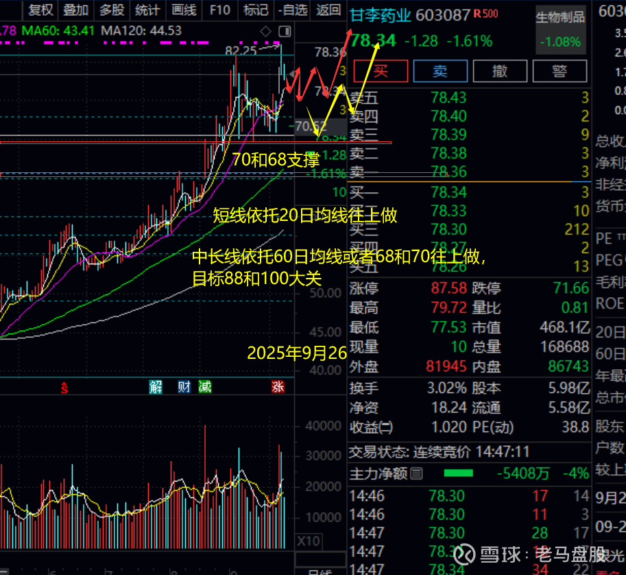 $甘李药业(SH603087)$ 凭借胰岛素和减肥药概念,业绩在逐步回升,要求不高,能回到历史峰值的一半,也就是88附近即可,后面业绩持续回升的话,100大关甚至120目标也未尝不可。