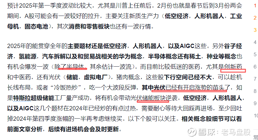 从题材上来看,创新药,机器人,算力产业链,固态电池,还有低空经济,这几个是未来的一种趋势,不过这类题材往往预期先行,大起大落,遇到大回踩做大波段是最好的,低空经济第二轮翻炒还没到来,但是也要关注。