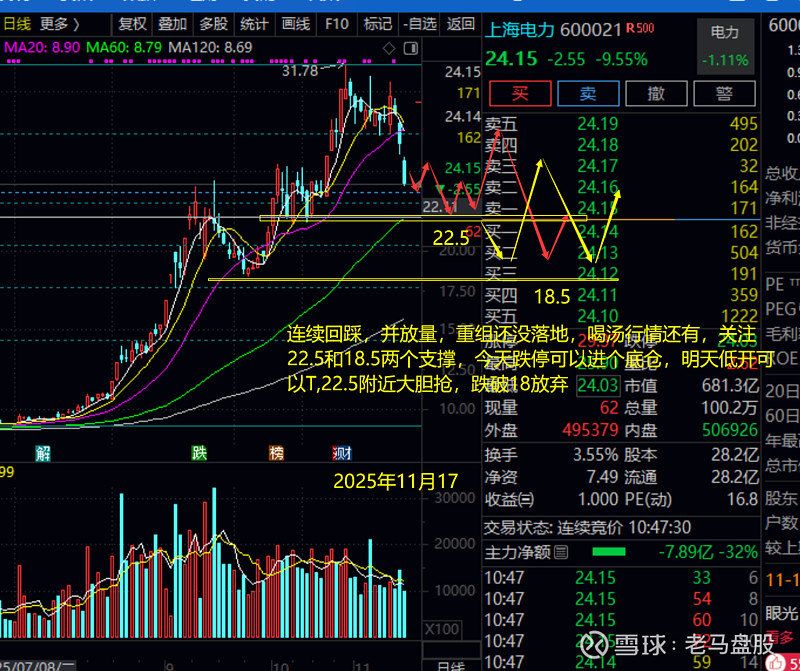 $上海电力(SH600021)$ 富贵险中求,这个股最强阶段已过,这两天大回踩巨额资金流出,前期主力明显出逃,但是资产注入炒作还没落地,10-20个点喝汤行情还有的,适合短线技术玩家,60日均线附近估计会止跌反弹,这种玩法仅能一次。没有短线止盈止损执行力的切忌参与
