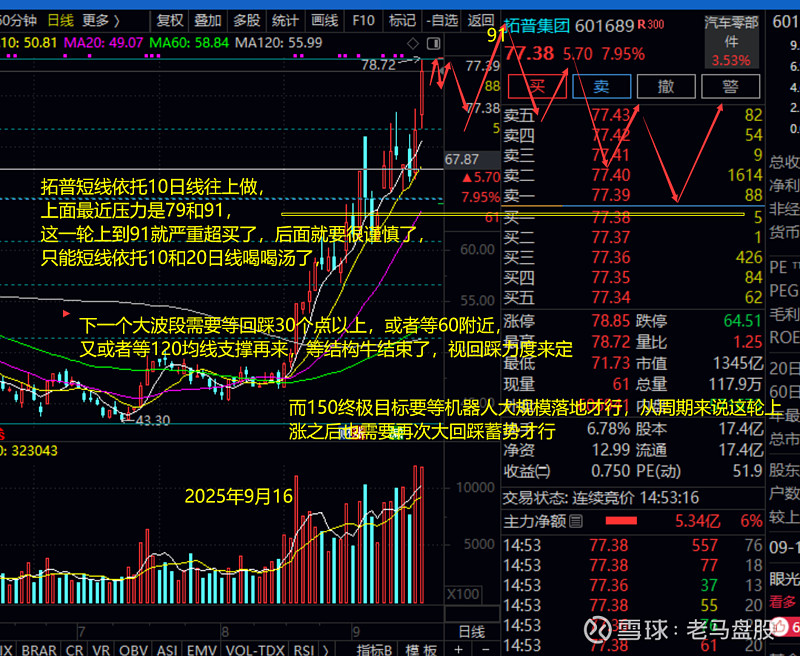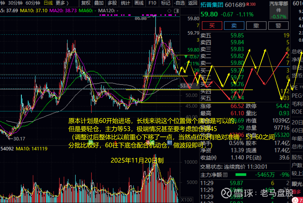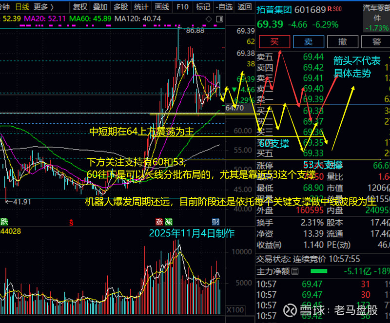 另外一个代表是拓普集团,拓普走势比预期弱一点,主要是股东减持,导致基本面近期受影响,大思路略微调整了一下,但是整体变化不大。就是60下方才开始考虑下一轮布局,最好等到53这大支撑。