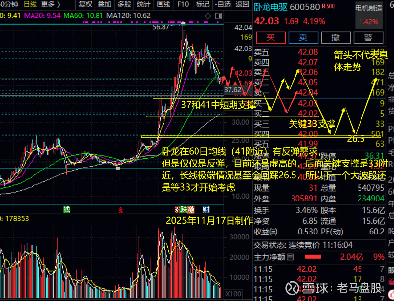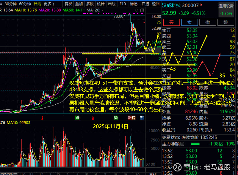 第二梯队的比较多,卧龙电驱和汉威科技两个是重点(灵巧手)。卧龙走势整体符合预期,9月中大涨时候就提醒到了55要谨慎,需要回踩36或者33再考虑,目前支撑略微调整,具体如下:33关键支撑不变,往下增加了26.5这个可能