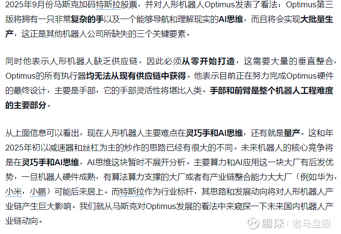 马斯克在9月份时候透露,当下人形主要难点在灵巧手和AI思维,还有就是量产。目前这三个要点都没形成突破。硬件和AI思维都是不断迭代的,这两个突破了,量产也自然跟上。特斯拉Optimus量产时间已经推迟到2026年,就算明年能如期量产,其应用范围估计有比较局限,主要做工厂,餐台等一些重复性工作为主,不过这足以引起相关机器人股的新一轮炒作。