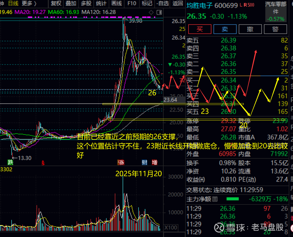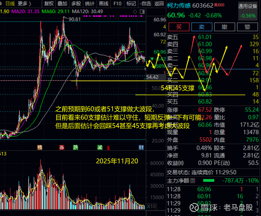 另外一个需要调整的是柯力传感,之前预期这两个回踩60和51支撑再考虑下一个大波段的,目前调整为54和45支撑。还有均胜电子,26和23的支撑,调整为23和21