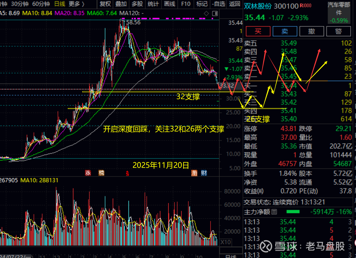 还有曾经的小甜甜双利股份,目前终于开始深度回踩,关注32和26大支撑再考虑大波段