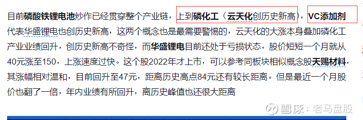 首先,明显过热虚高的,是磷化工和VC添加剂概念,磷化工本身重心在农业,VC这种小众产品价格容易被控制,但是这些其实产能也充足。类似的还有氟化工,本来氟化工前面炒制冷剂就已经虚高炒一波了。多氟多和天际股份更偏向六氟磷酸锂这种中间品,所以走势才那么强悍,因为这次储能带动的核心就是磷酸铁锂电池,但是这两个股价都已经接近2021年巅峰时候了,而碳酸锂期货价格还在山脚下刚站稳回暖,价格只有顶峰时期的五分之一。即使股价先行,也不至于脱离期货价格太远,再说碳酸锂目前供需还处于平衡状态。所以未来,云天化将回归农业化工行情;华盛锂电,多氟多和天际股份将至少回调这轮涨幅的一半以上(短期回踩20日均线或者回踩30个点左右还会反弹挣扎,但是仅仅是反弹了)
