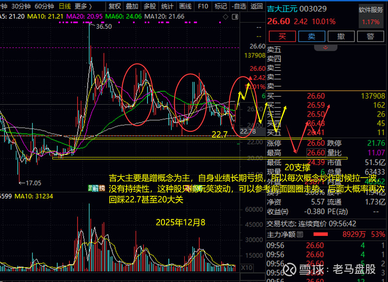 $吉大正元(SZ003029)$ 已经几个月没跟进了,因为稳定币概念熄火,而且吉大在稳定币当周不是主要的,但是蹭概念是一直没落下。最近蹭上了量子通讯概念,再次异动。技术上看吉大已经跌破了120日线支撑(24下方),今天再次拉起,这个股注定是玩下小波段的,参考图中圆圈走势,后面大概率再次回踩22.7甚至20横盘蓄势。