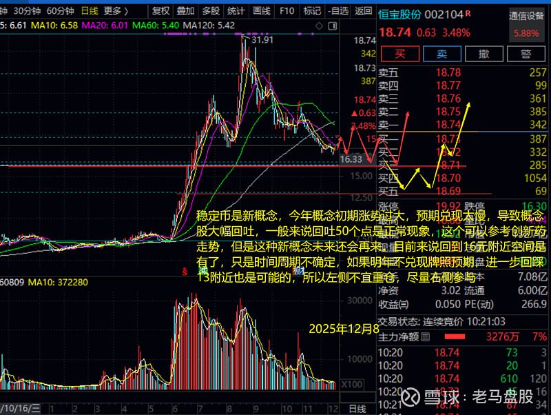 至于稳定币概念,$恒宝股份(SZ002104)$ 跌破19支撑,离16支撑一步之遥。近期虽然短暂反弹,但是整个概念还处于低迷调整期,虽然还有翻炒机会,但是不会像今年那么强烈了,而且如果明年不牌照不落地,估计会进一步回吐。所以如果有底仓的趁着反弹可以适当减一下,等回踩再来。这样拉低均价。最好等待右侧,政策明显到了再参与,左侧的话参考大支撑来,需要较好的仓位控制和耐心才行