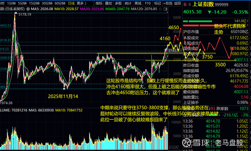 目前上证和创业板/深成指的形态是有点不一致的,但是大盘整体思路其实没变的,尽管上证有大回踩迹象,但是维稳态势还在,有一个像样的回踩反而是好事。上证没到4160就先回踩3800附近支撑了,3750-3800这个中短期支撑还有待考验,至于能否上破4160冲击4650这个不重要,关键是上面维稳态度还在,周期上,上证指数就算不继续上攻4650,也可能出现2021年那种高位宽幅震荡大半年的态势。