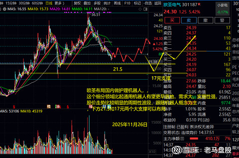 $欧圣电气(SZ301187)$ 的策略要修改一下,原本是反弹一下后等再次回踩21.5支撑再布局的。但是目前机器人板块已经逐渐站稳,短期回踩力度有限,所以才有底仓加波段比较好,靠近24可以做底仓先。欧圣不是机器人主力,只是垂直实用性强,护理机器人为主。其走势可以参考割草机一类的中坚科技。明年初机器人板块大概率出现一个大波段拉升。三花和拓普已经稳步拉升,$天奇股份(SZ002009)$ 连板,$汉威科技(SZ300007)$ 缓慢回升中