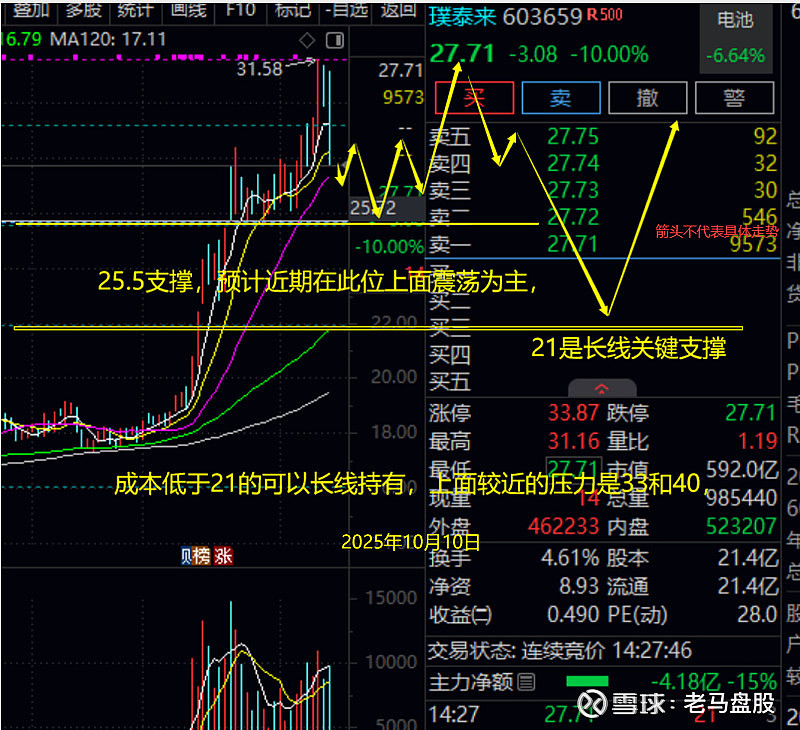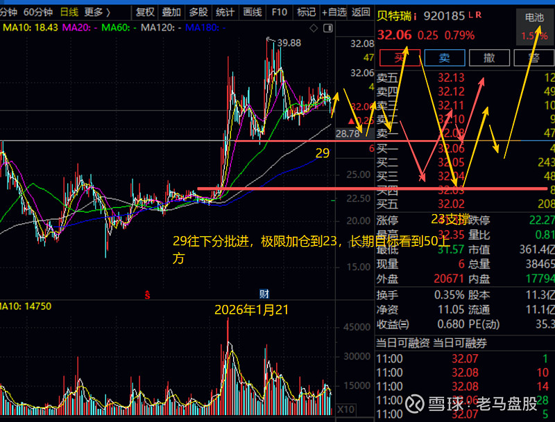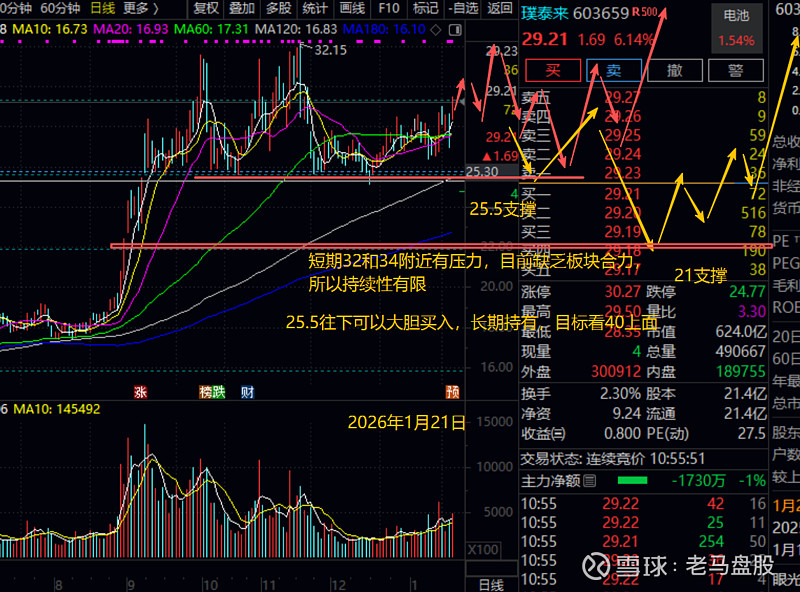 $璞泰来(SH603659)$ 业绩预增,在正负极电解液等中游电池材料这一方面,璞泰来业绩是最稳的,估值也是相对较低的,之前分享固态电池时候,其作为负极材料代表,也是长期追踪的。技术上,璞泰来也刚好回踩到25.5附近支撑横盘蓄势,但是目前还没到爆发期,如果大盘回踩,可能将其压制到21支撑,那就更理想了,长线来说,25.5往下都可以分批进。目标40上方