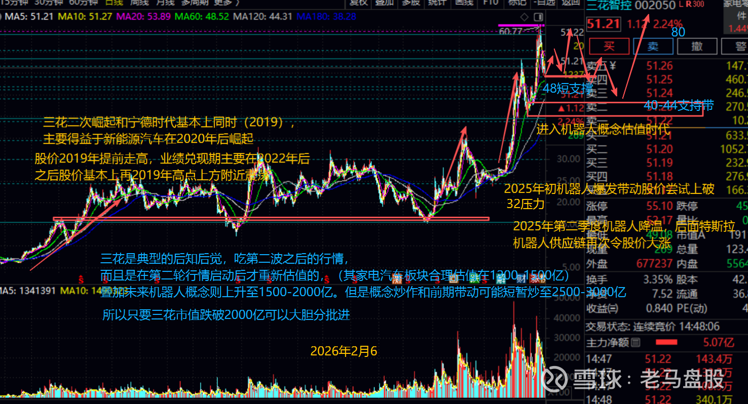 三花/拓普和中际旭创走势有些不一样,中际目前进入业绩兑现期,走势更稳更有韧性,而三花/拓普还是处于概念前期炒作,胜在原本产业实力雄厚,现金流充足,而且家电汽车产业跨界机器人的相关性也大一些。所以三花和拓普是兼具进攻和防守好标的,其回踩空间比中际旭创要大,未来翻炒机会也更多。而这种股比较理想的参与位置一般是回踩30个点左右作为一个进场的波段,当然极端情况还是要考虑回踩40-50个点的可能。