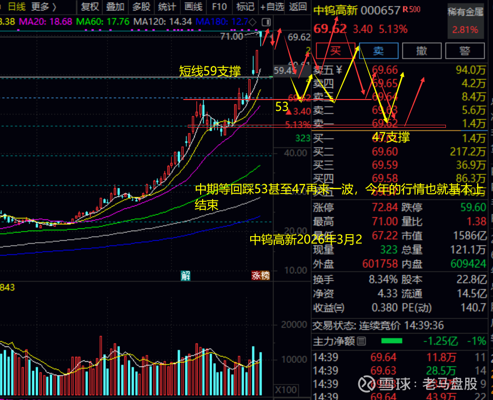 整体来说金银油和化工股,或者军工股,能持续到周三就不错了,部分的明天高开就减了。湖南黄金,四川黄金,晓程科技是比较受短线影响的,这几个明后天要减了,另外中东局势对银子影响是比较小的,切勿乱追涨。紫金矿业长期还是比较稳,可以长期防守用。
