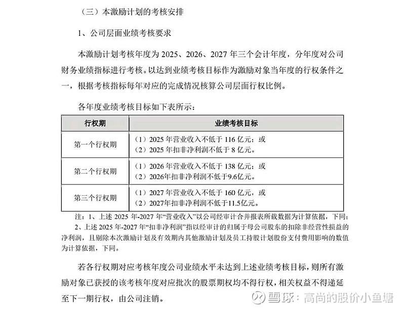 第一个行权期未达标。后面两期能达标的话,总市值炒到3、500亿那是很轻松的。就拿今晚这份报表来看,公司的各项业务实在找不出后面两期股权激励能达标的理由,看不到希望。就拿26年来说,营收不低于138亿,看看现在的公司业务,26年想增加28亿营收,那个板块能给实现了??? 除非 或(2)扣非净利润不低于9.6亿这个能达标也行,看看各板块那可怜的毛利率,这个(2)也是基本属于不可能完成的任务!!!