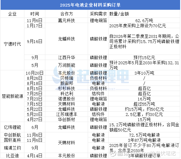 近年来储能锂电行业需求爆发,为保障供应链稳定、锁定核心资源,行业内涌现出大量覆盖正极材料、电解液、铜箔等多环节的长协订单,其中2025年的订单尤为密集且规模庞大。