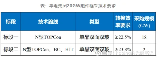 2025年7月,华电集团发布2025—2026年光伏组件集中采购招标公告,首次涉及23.8%高效组件单独招标(以前是分技术),将三大技术高效组件统一用统一效率值划分,彼时高效组件占比仅有10%。