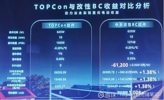 中来不仅为客户提供更多高价值产品的选择,也切实为客户提供了更高收益的产品,根据其测算,其改性BC组件在项目上减少了0.612分/W 的BOS成本。