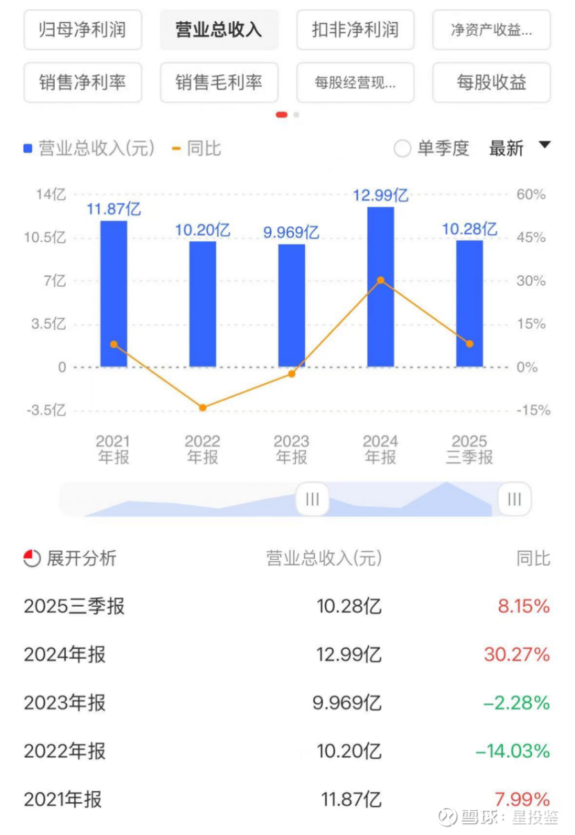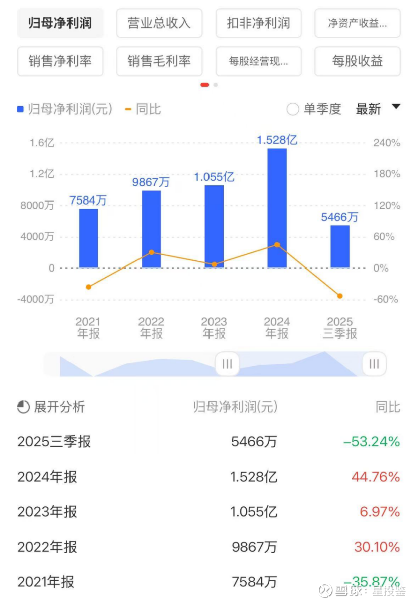 2025年前三季度营业总收入10.28亿元,同比增加8.15%,归母净利润5466万元,同比减少53.24%,第三季度营业总收入4.434亿元,同比增长4.37%,归母净利润2403万元,同比减少50.58%。