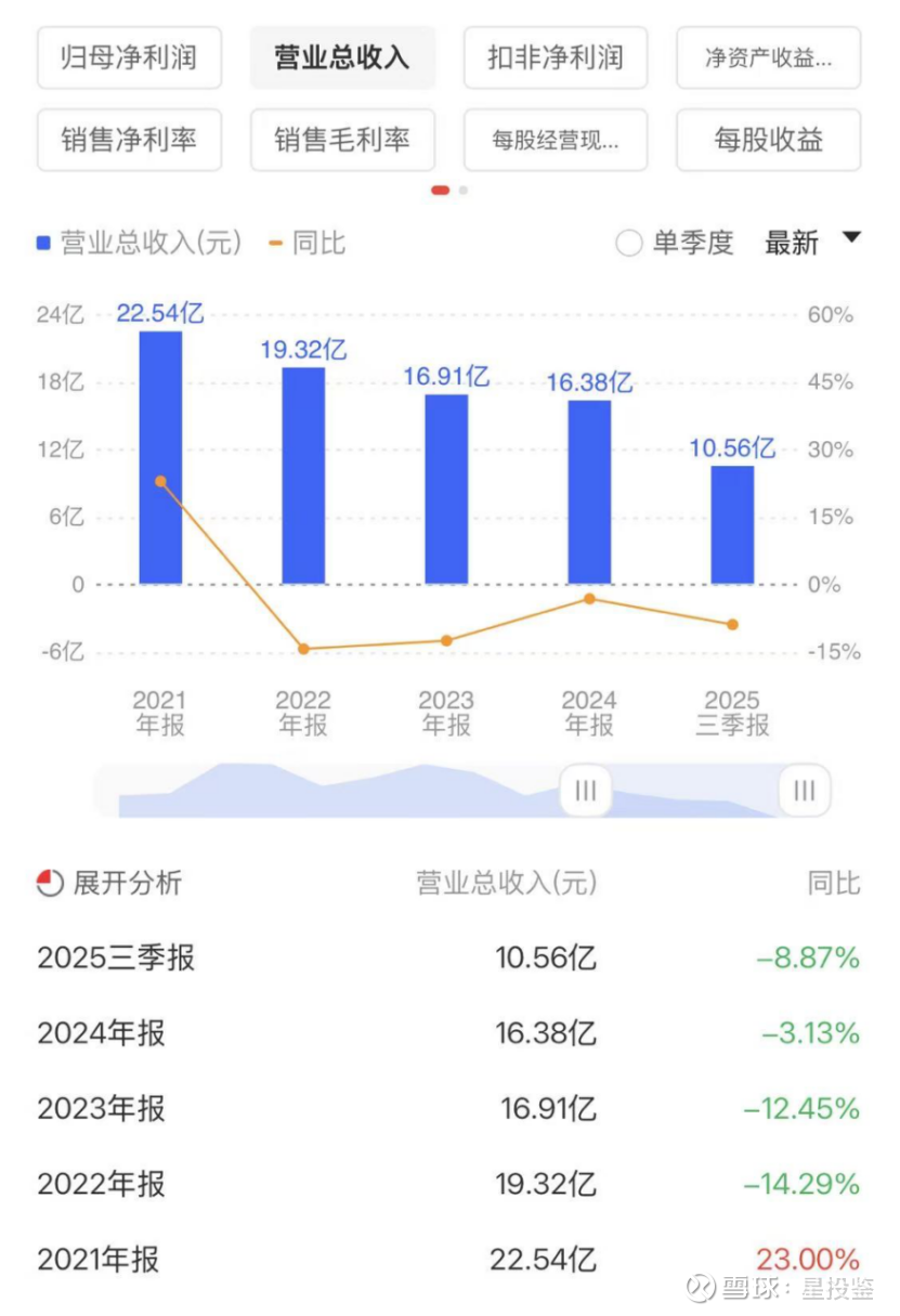 2025年前三季度营收:10.56亿,利润:1443.94万,同比下降89%。